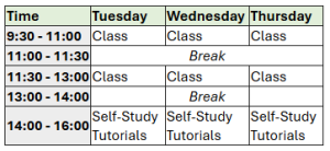 You may also come to the campus on Monday and Tuesday for self-study from 9:30 – 17:00 if you wish.